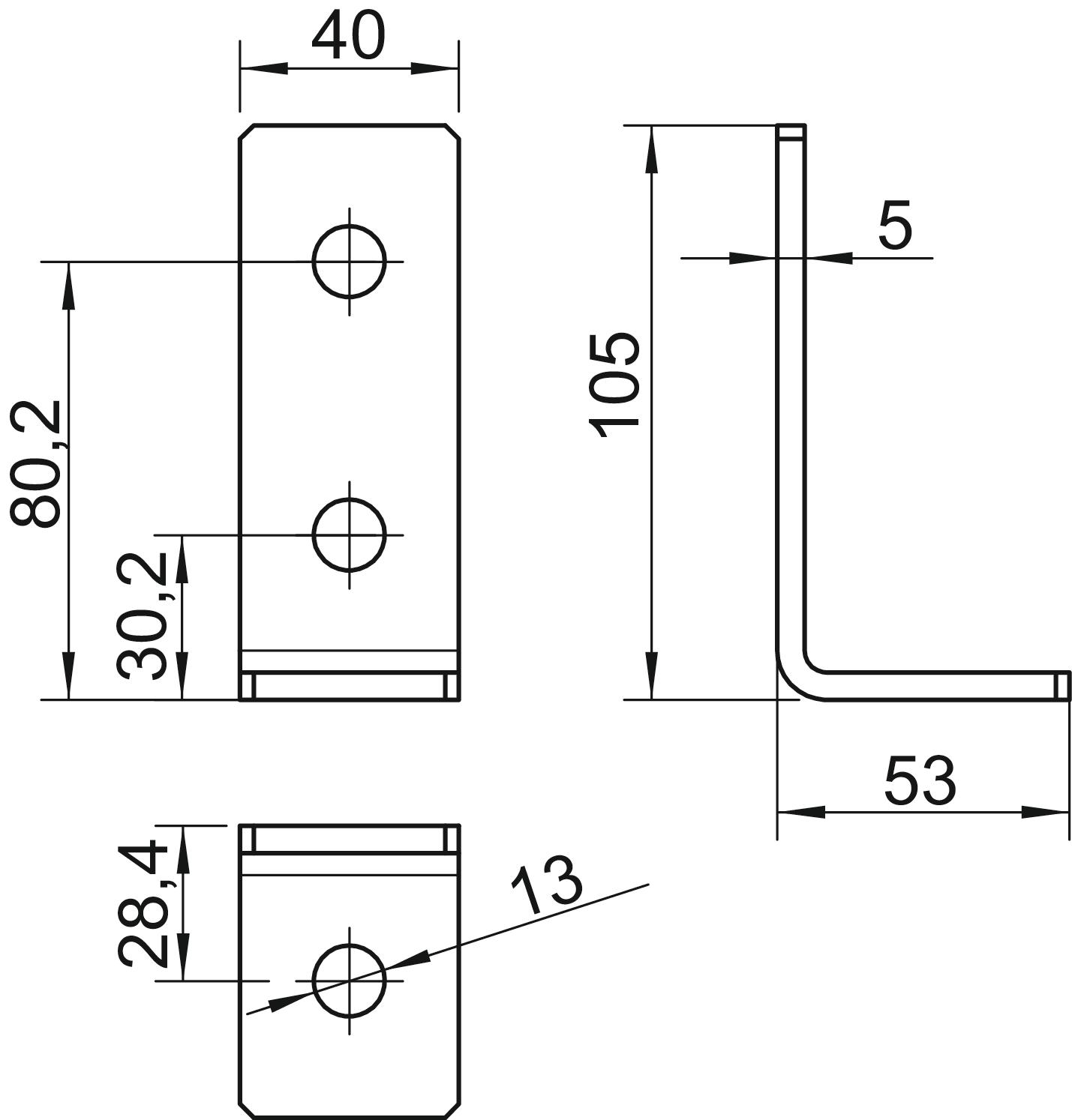 Descrierea produsuluiCornierul de montaj cu 3 perforaţii pentru conectarea şinelor profilate 41 x 41 mm şi 41 x 21 mm în unghiul de 90°.