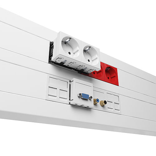 Întrerupătoarele, prizele și elementele de tehnologie de date ale liniilor de produse OBO Modul 45 și Modul 45connect sunt completarea perfectă pentru Rapid 45-2. Acestea se pot clipsa cu ușurință în profilul canalului printr-o singură mișcare. Un sistem compact care poate fi montat cu ușurință și poate fi extins fără probleme. Eforturile de montare a aparatelor sunt mult mai reduse comparativ cu tipurile de instalare tradiționale. Pentru montaj nu mai sunt necesare elemente componente suplimentare, cum ar fi doze pentru aparate, adaptoare sau rame de acoperire.