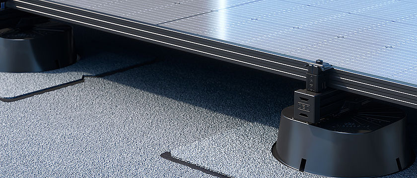 Pe acoperișurile tip terasă, sistemul Magic PV Flat Pro nu numai că asigură montarea fără șuruburi și unelte, dar impresionează și prin componentele flexibile ale sistemului și sistemul de balast UniBase pentru îngreunarea variabilă a întregului sistem.